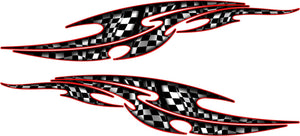 These Tribal Checkered Flag vinyl decals are made for cars and trucks that live for green lights and finish lines. The stretched tribal blades are filled with a sculpted black-and-white checkered pattern, outlined in a bright red edge that pops hard against almost any paint colour. From the first curve behind the front wheel to the long sweep toward the rear quarter, your vehicle instantly looks lower, faster and ready for race day.