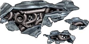 This hood graphic is made for builds that want something different than the usual flames or plain stripes. You get a realistic chrome-style tear, but underneath it is a mechanical steampunk world—pipes, turbine-like shapes, and industrial detail—like the hood cracked open and revealed something engineered and mean.