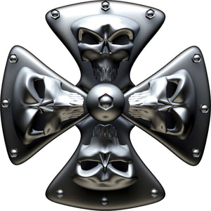 If your ride lives in the fast lane and the dark side, this design belongs on your doors. This metallic Maltese-style cross is packed with four snarling chrome skulls, each one sculpted with deep shadows and smooth highlights that look like real metal. On a black truck or a bright muscle car, the dark chrome finish hits like a custom badge forged in a performance shop.
