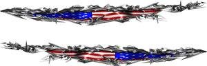Design: Waving American flag revealed through sharp chrome ripper tears with 3D shading.