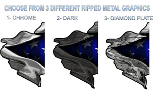 Show your patriotism and make a bold statement with our American Flag Tears Car and Truck Decals. This powerful design features a vivid American flag seemingly bursting through realistic metal-style tears, instantly adding striking depth and dimension to your vehicle's appearance.